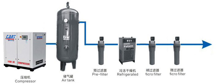 1.空氣濾清器 、2.進氣控制閥 、3.主機 、4.油氣分離器 7.最小壓力閥 、8.后冷卻器 、10.氣水分離器。